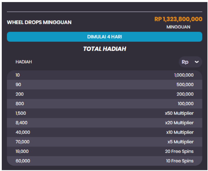 3. Total Hadiah Event ini adalah sebesar IDR 3.180.000.000 yang akan dibagikan selama periode promosi. Pemain dapat banyak kesempatan untuk memenangkan cash drop setiap hari dengan hadiah hingga IDR 2.385.000 dan hadiah mega yang ditingkatkan hingga IDR 15.900.000 setiap akhir pekan.