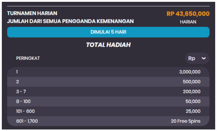 3. Hadiah akan dikirimkan ke saldo permainan Spadegaming dalam 72 jam setelah turnamen berakhir.